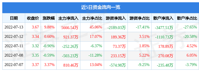 资金流向数据方面,7月13日主力资金净流入5666.54万元,游资资金净流出2189.03万元,散户资金净流出3477.51万元。